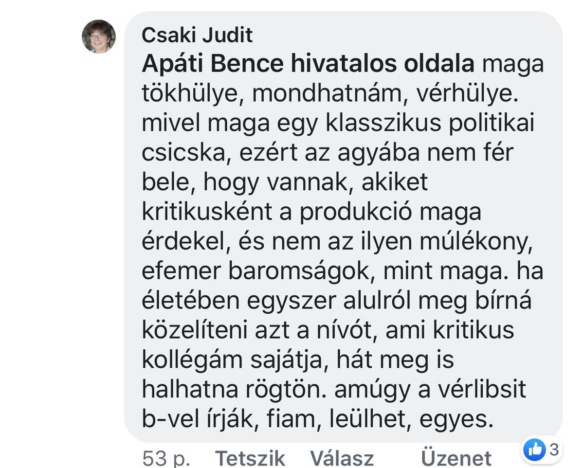 Apáti Bencét, a Budapesti Operettszínház balettigazgatóját pedig a megszokottnál is ocsmányabban gyalázta 2019-ben, amikor bemutatták a fantasztikus sikert arató Csárdáskirálynőt a Kiss-B. Atilla vezetésével megújult Budapesti Operettszínházban.11 Nyelvtani hibáktól hemzsegő – sokak szerint nem is részegen írt – hozzászólásában csicskának, vérhülyének és ostobának nevezte az ismert balettművészt. Csak azért, mert másként gondolkozik bizonyos kérdésekről, mint ő.