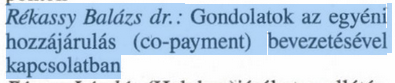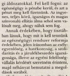 "Fel kell fogni: az egészségügy is pénzbe kerül, és azt a pénzt meg kell fizetnünk. Az ingyenes, teljes körű, igazságos és magas színvonalú ellátás álma sehol sem valósult meg, nálunk sem fog"- vélekedett Rékassy11