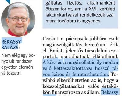 Álláspontja pedig azóta sem változott, 2024-ben konkrétan kimondta: "a köz- és a magánellátás ily módon való kettészakítottsága hosszú távon káros és fenntarthatatlan".12