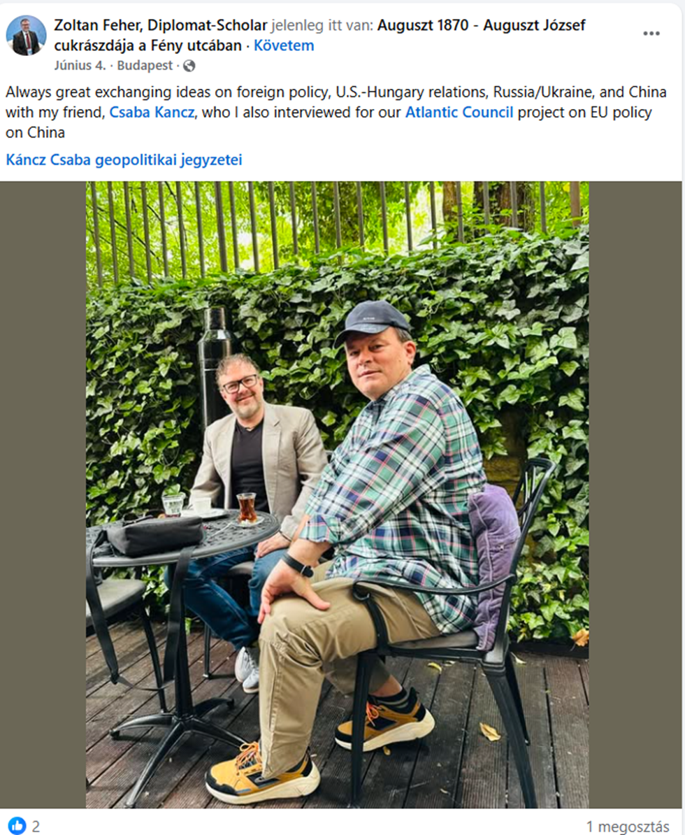 Nem mellesleg Fehér az erősen Soros-kötődésű, washingtoni Atlantic Council elemzőjeként dolgozik.14 Júniusi posztjában15 azzal dicsekedett, hogy Kánczal interjút készített az Európai Unió Kína-politikájáról. Ez is azt mutatja, hogy